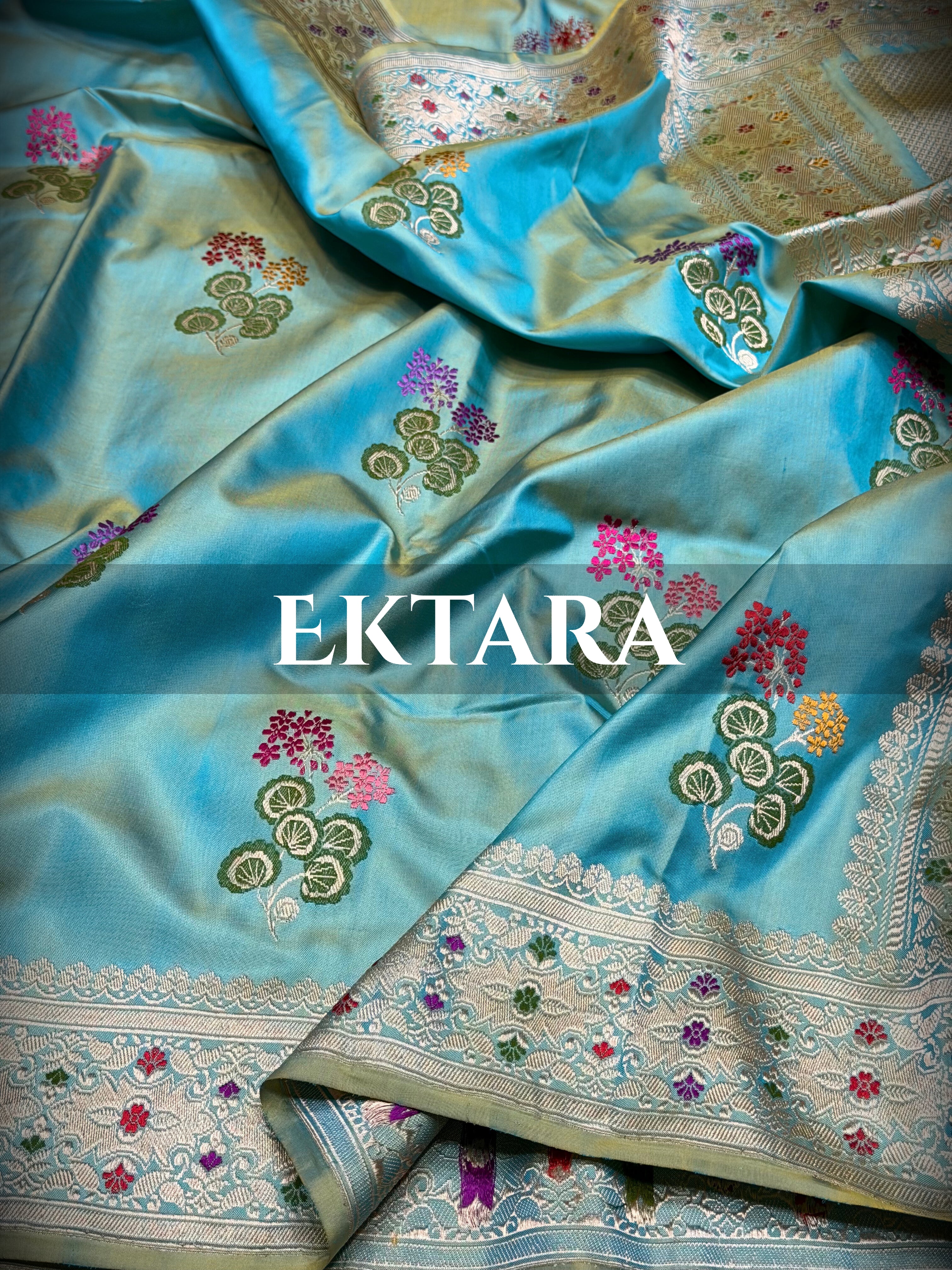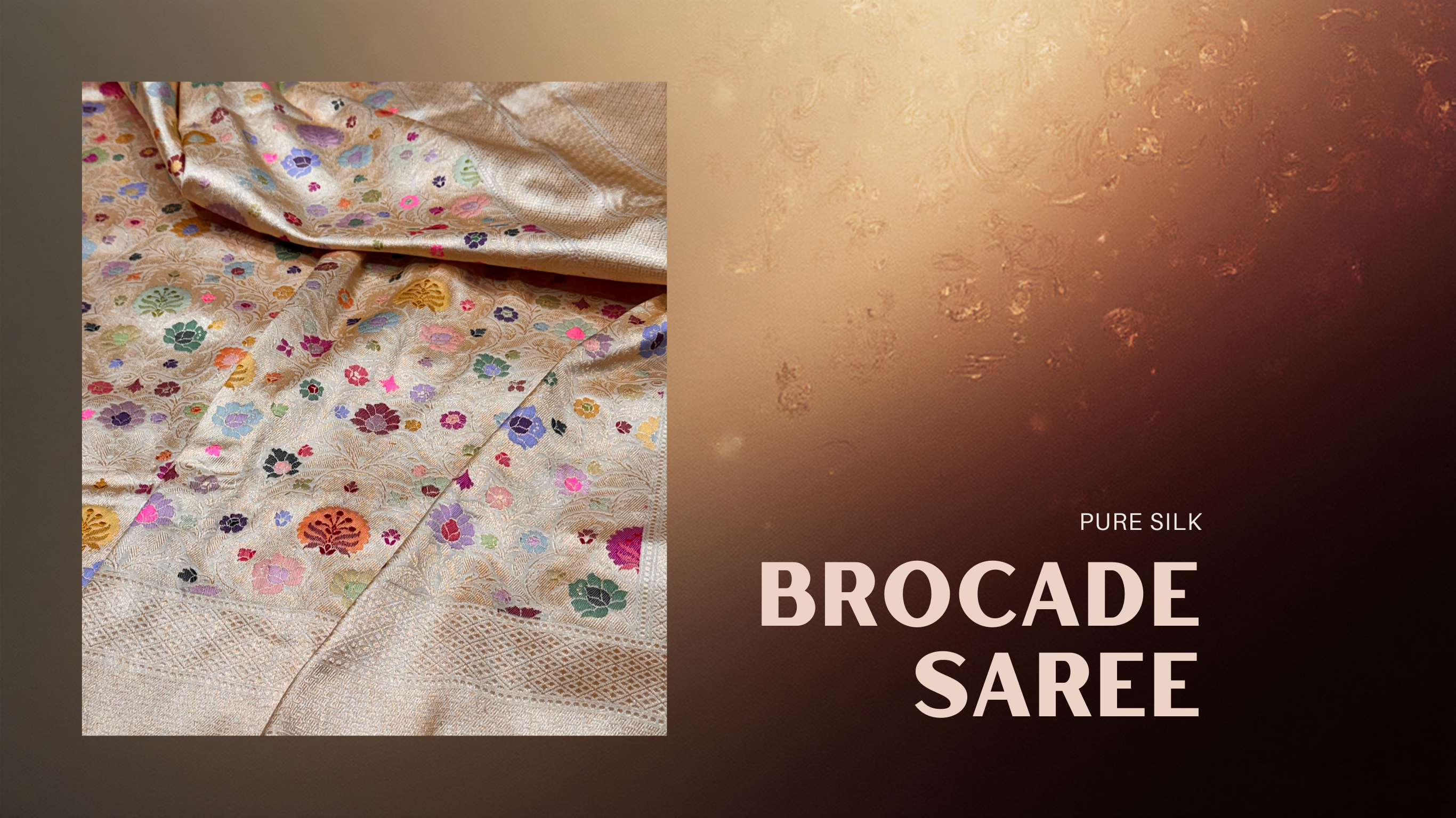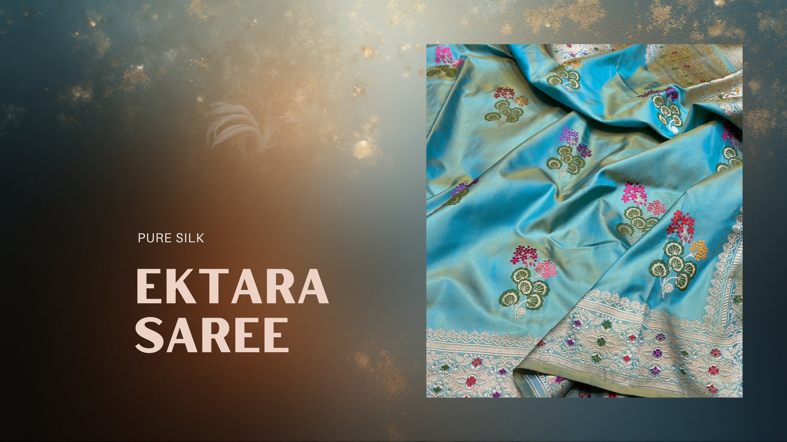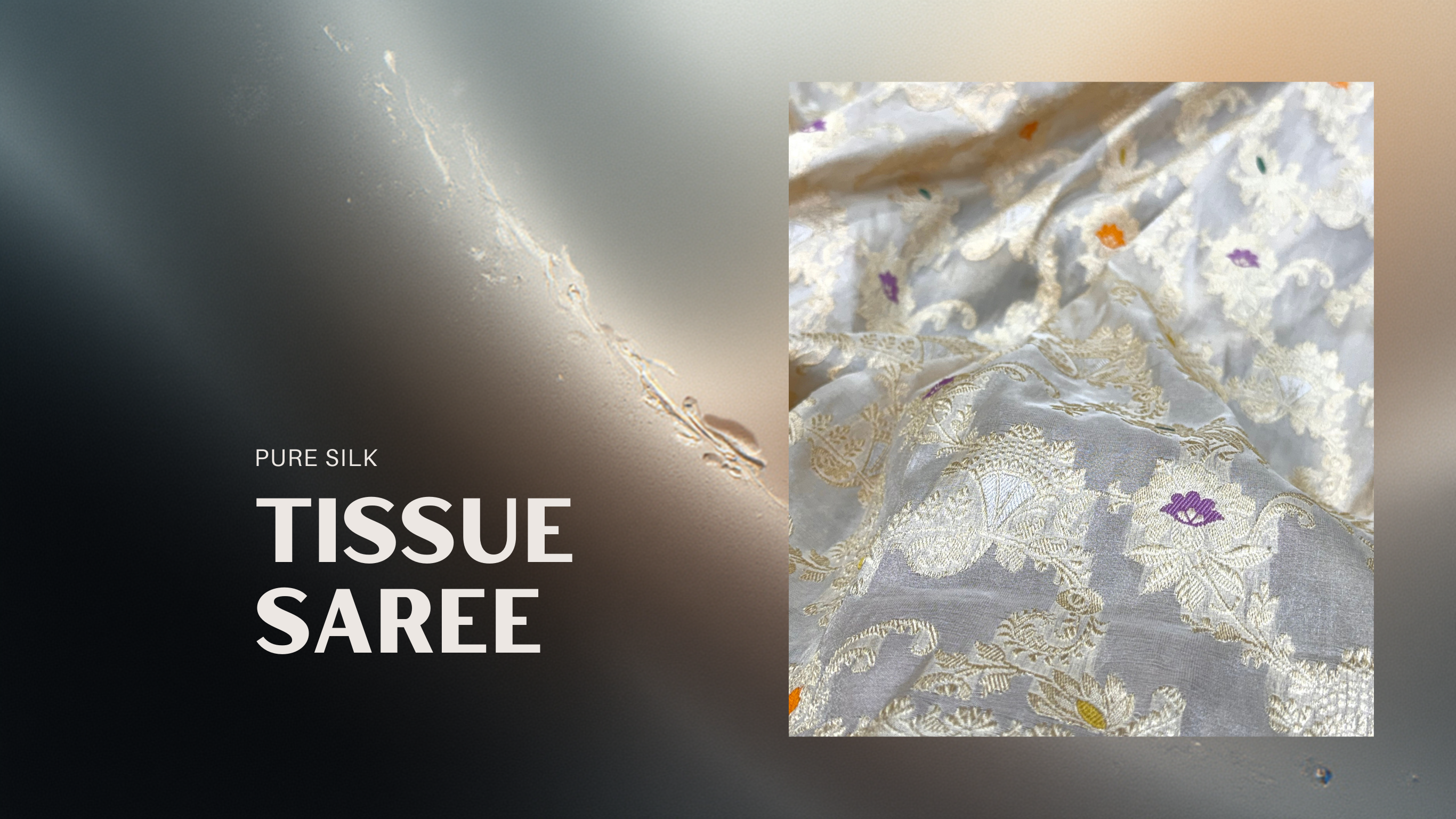 Each saree is handwoven in Banaras using traditional looms and 100% pure silk, preserving centuries of craftsmanship.