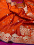 Orange Handwoven Pure Banarasi Satin Silk Saree – Kadwa Weave | 100% Pure Satin Silk | Authentic Banaras Handloom